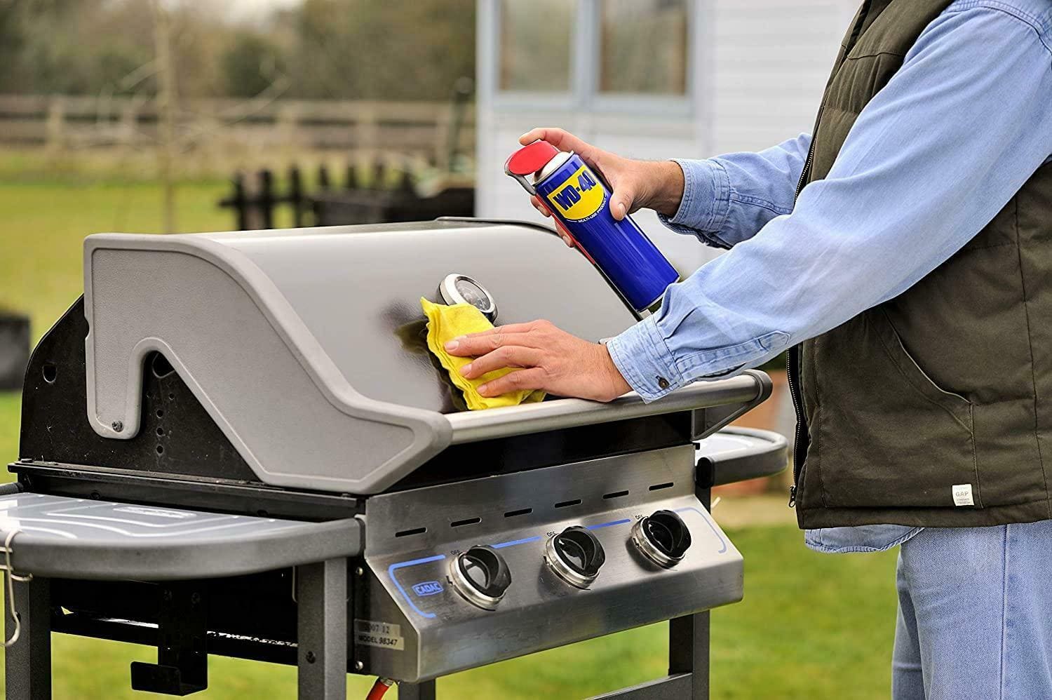 - Auftragen: Sprühe das WD-40 Multifunktionsprodukt grosszügig auf die verschmutzten Flächen deines Grills, einschliesslich Grillrost, Brenner, Fettauffangschale und Innenraum.